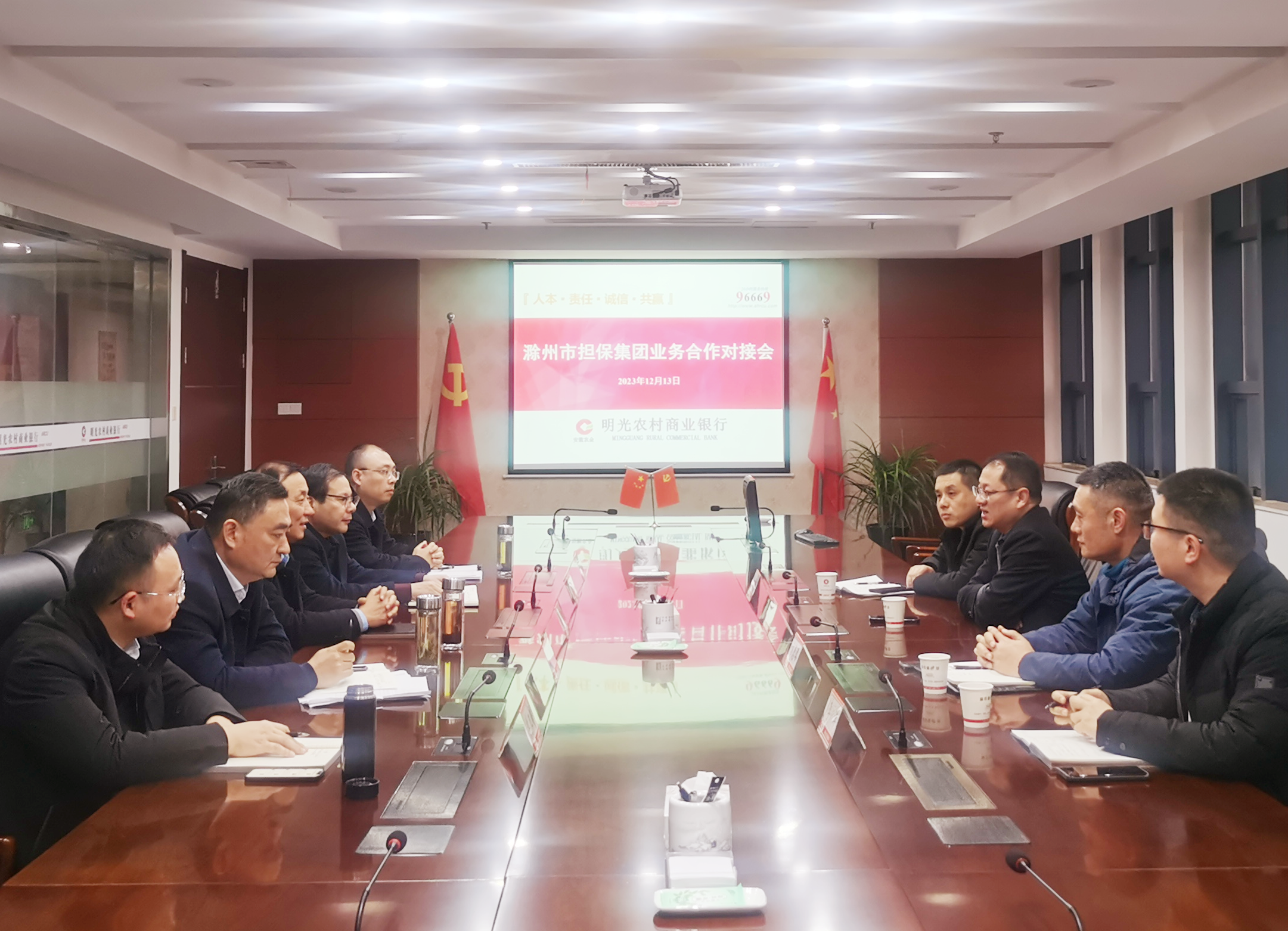 12月13日,市擔(dān)保集團(tuán)黨委委員、副總經(jīng)理張健帶隊(duì)前往明光農(nóng)商行開(kāi)展業(yè)務(wù)交流,明光農(nóng)商行董事長(zhǎng)任路明及相關(guān)領(lǐng)導(dǎo)參加座談。