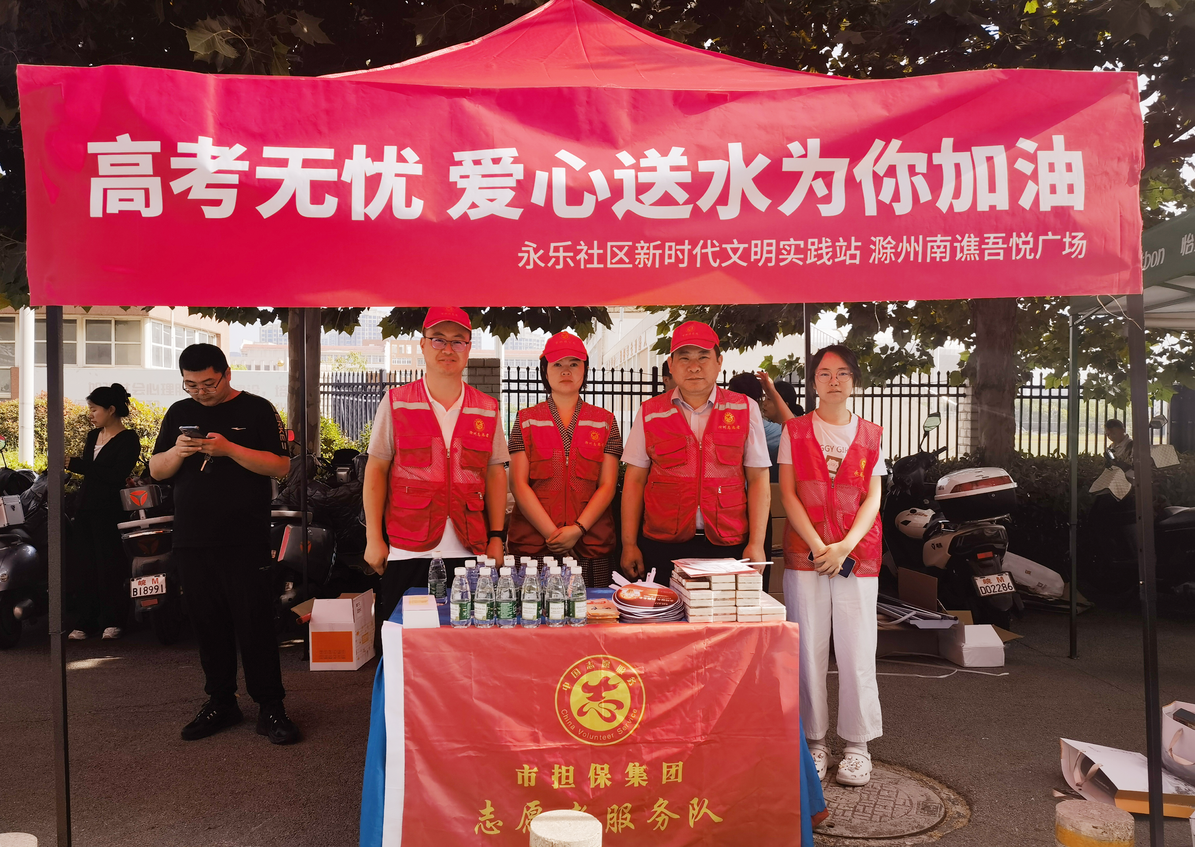 考場(chǎng)外,市擔(dān)保集團(tuán)聯(lián)合永樂社區(qū)設(shè)立了愛心驛站,搭建遮陽(yáng)棚,布置休息、乘涼等候區(qū),為過往考生、陪考家長(zhǎng)免費(fèi)提供礦泉水、扇子、清涼油等防暑降溫物品和應(yīng)急文具。同時(shí),志愿者們主動(dòng)服務(wù),與考生家長(zhǎng)熱情交流,緩解他們的緊張情緒。