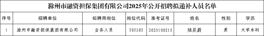 根據(jù)《滁州市融資擔(dān)保集團(tuán)有限公司2025年公開招聘工作人員公告》相關(guān)規(guī)定,經(jīng)報名、資格審查、筆試、面試、體檢、考察等招聘程序,現(xiàn)將擬遞補(bǔ)人員予以公示。