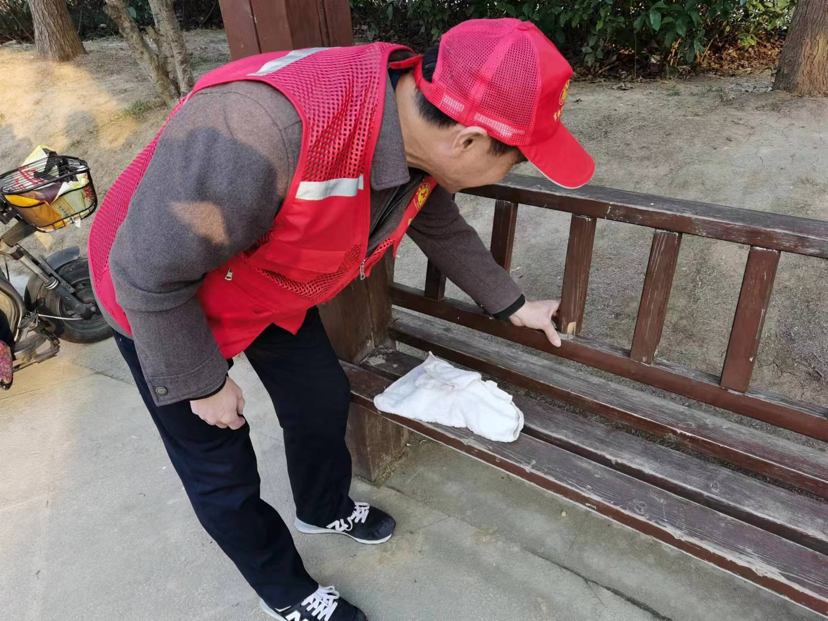 黨員志愿者在幫助小區(qū)維修損壞的長椅