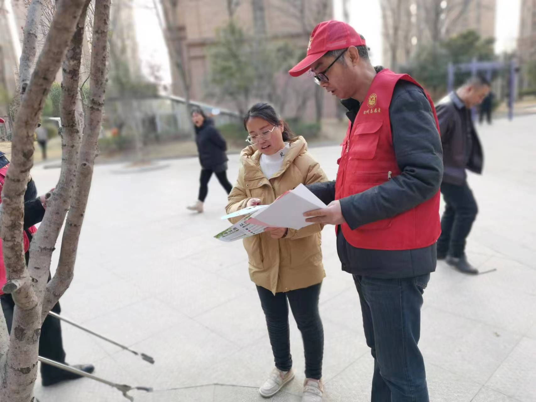 黨員志愿者向小區(qū)居民宣傳垃圾分類知識(shí)